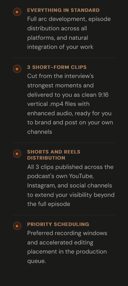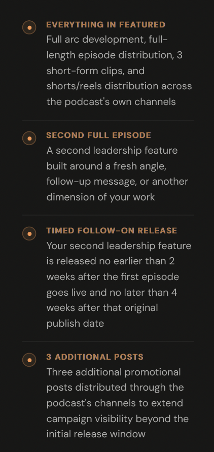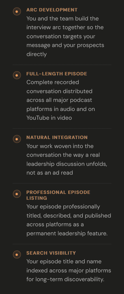 A dedicated episode built around you and the ideas your audience needs to hear. You help us shape the conversation. We handle the rest.